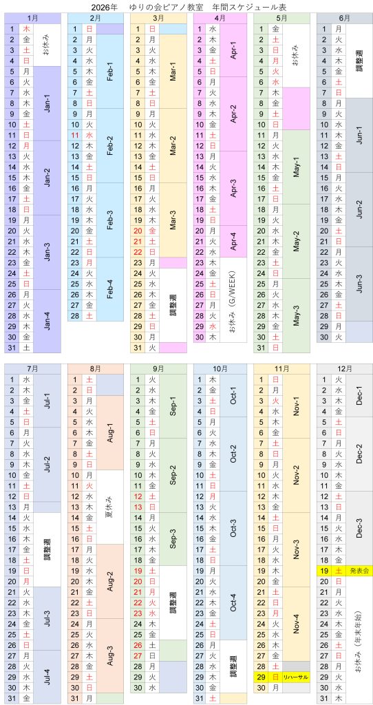 PTNAアドバイザー業務やコンクール対応のため調整週を設けています。調整週は通常のレッスンはありません。